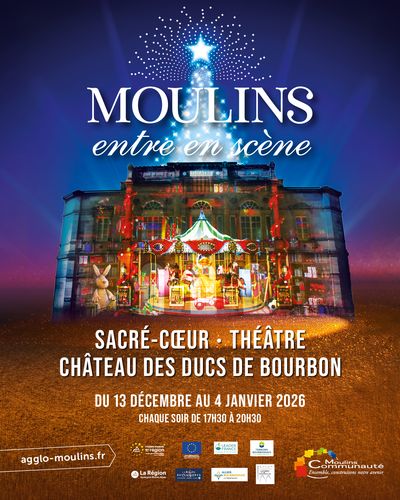 Du 13 décembre 2025 au 4 janvier 2026, les illuminations Moulins entre en scène reviennent chaque soir à la tombée de la nuit, pour plonger les petits et les grands dans la féérie des fêtes de fin d’année.