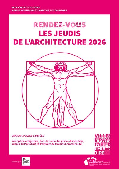 Le jeudi de l’architecture a lieu un jeudi soir par mois, 19h à la salle des fêtes de Moulins ou autre lieu. Pour chaque rendez-vous un thème différent est abordé. La conférence est réalisée par un guide-conférencier, ou la présentation suivie d’un film documentaire sur l’architecture en provenance du Centre National du Cinéma, collection Images de la culture.