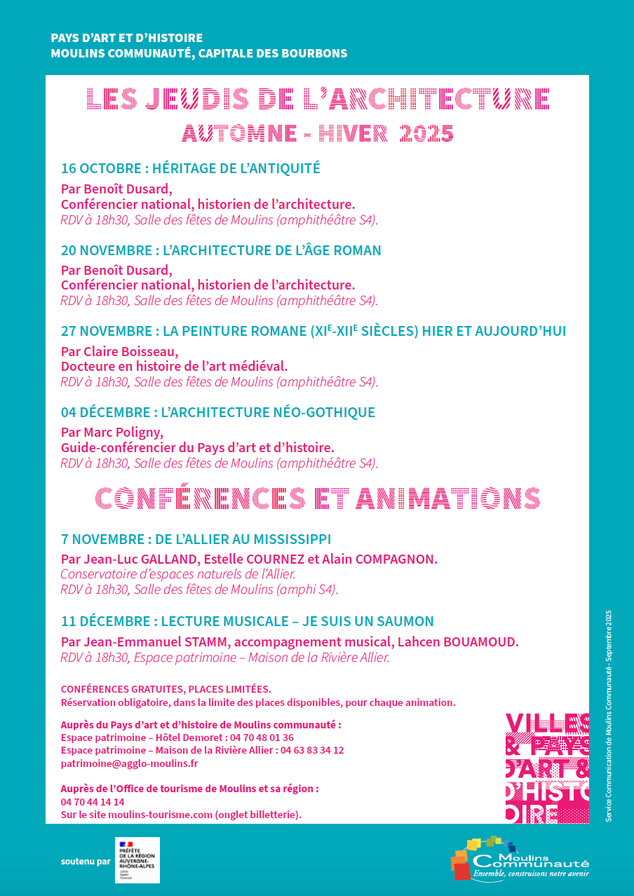 Entrée libre, réservation obligatoire au 04 70 48 01 36 ou sur patrimoine@agglo-moulins.fr